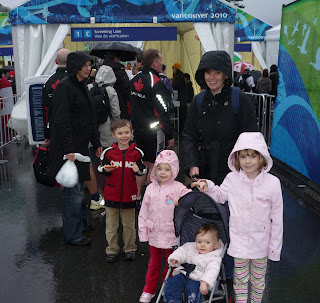 Friday February 26th was a fabulous day! Marley turned 6 years old (read all about her celebrations here) and we went as a family to the Short Track Speed Skating at the Coliseum. Those guys (and gals) really FLY around that rink! Watching it on TV just doesn't give you a true sense of their speed! We have friends who live near the venue so we parked at their house (thanks guys!), popped in for a quick visit and some warm muffins (more thanks!!) and then walked. In the rain. Yup, the gorgeous sunny days had come to an end and it was raining again in Vancouver. What a shock! NOT!!!
