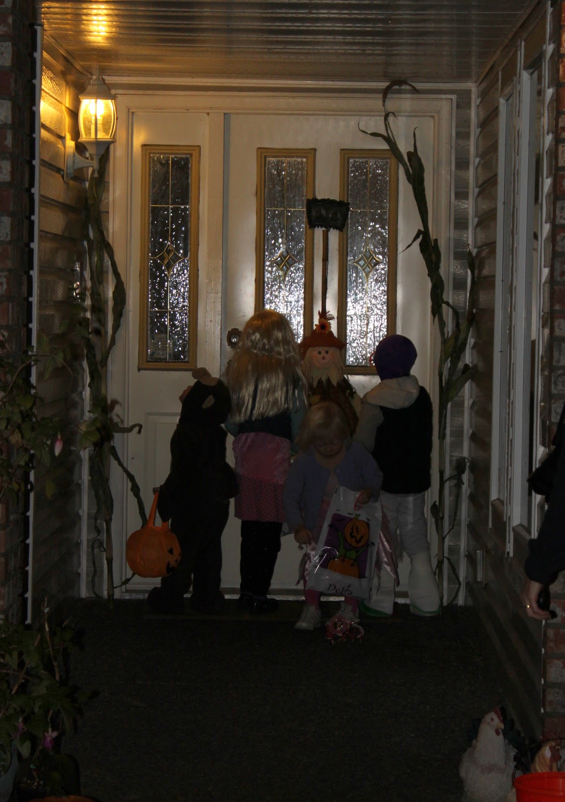 It's not the greatest picture but this is what our house looked like. The girls made a lot of pumkins, bats, cats and ghosts for the windows and Marley made a really good witch (in the window just above the jack'o'lanterns). I know that Hallowe'en is starting to take over from Christmas in popularity but I refuse to go crazy with decorations (so far). We threw these up earlier in the day and took them down the next day. Call me a Hallowe'en Scrooge but seriously, it's a holiday based on pagan rituals. NOT going there!!